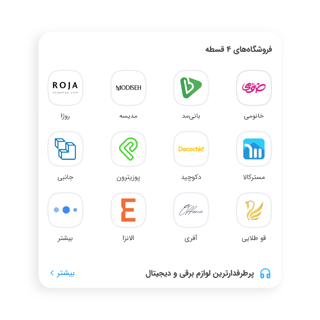 امکان خرید 4 قسطه اسنپپی در فروشگاههای مختلفی وجود دارد و این تعداد و تنوع فروشگاهها، دست شما را در انتخاب فروشگاه و برند باز میگذارد. همچنین اسنپپی در تلاش است که تعداد این فروشگاهها را افزایش دهد تا کاربران از خرید خود لذت بیشتری ببرند. در دستهبندی کالاهای مختلف خرید 4 قسطه، فروشگاههای متعددی جای میگیرند که از جمله آنها میتوان به موارد زیر اشاره کرد: